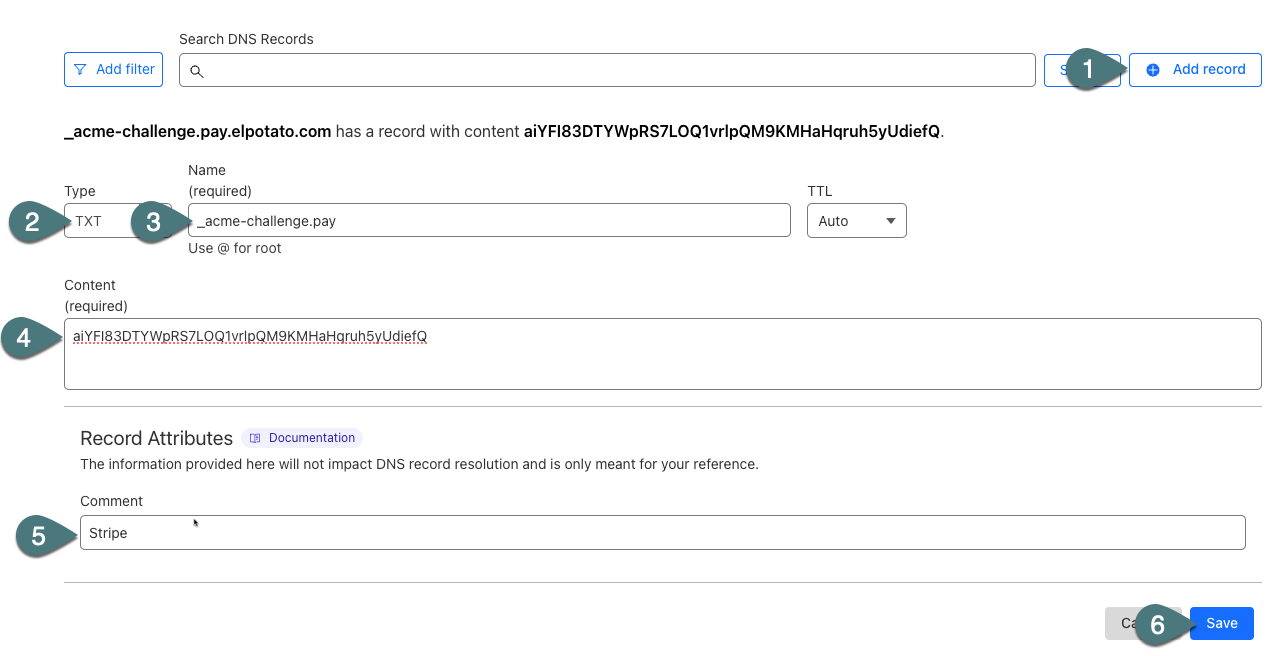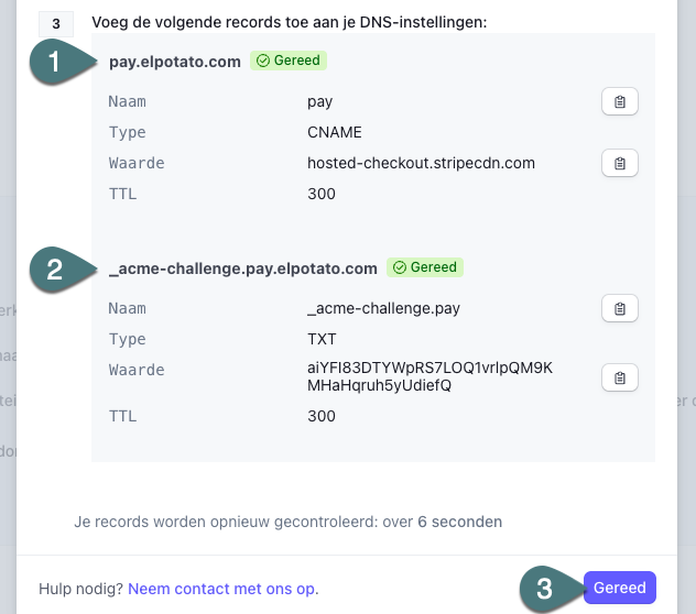 Stripe genereert automatisch de DNS-records (meestal CNAME) die je moet toevoegen bij je domeinbeheerder (bijv. Cloudflare, TransIP of GoDaddy).