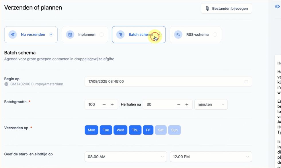 Met batch sending kun je grote e-maillijsten in kleine golven versturen, bijvoorbeeld 100 e-mails per uur. Handig bij het opwarmen van een lijst of een nieuwe server, zodat je domeinreputatie sterk blijft en je e-mails netjes in de inbox landen.