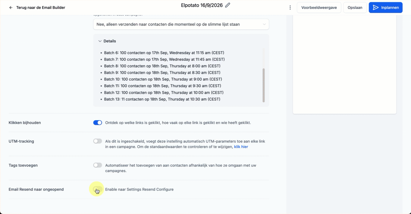 Met deze functie stuur je je campagne automatisch opnieuw naar mensen die je mail niet geopend hebben. Handig om meer bereik te halen zonder extra werk.
