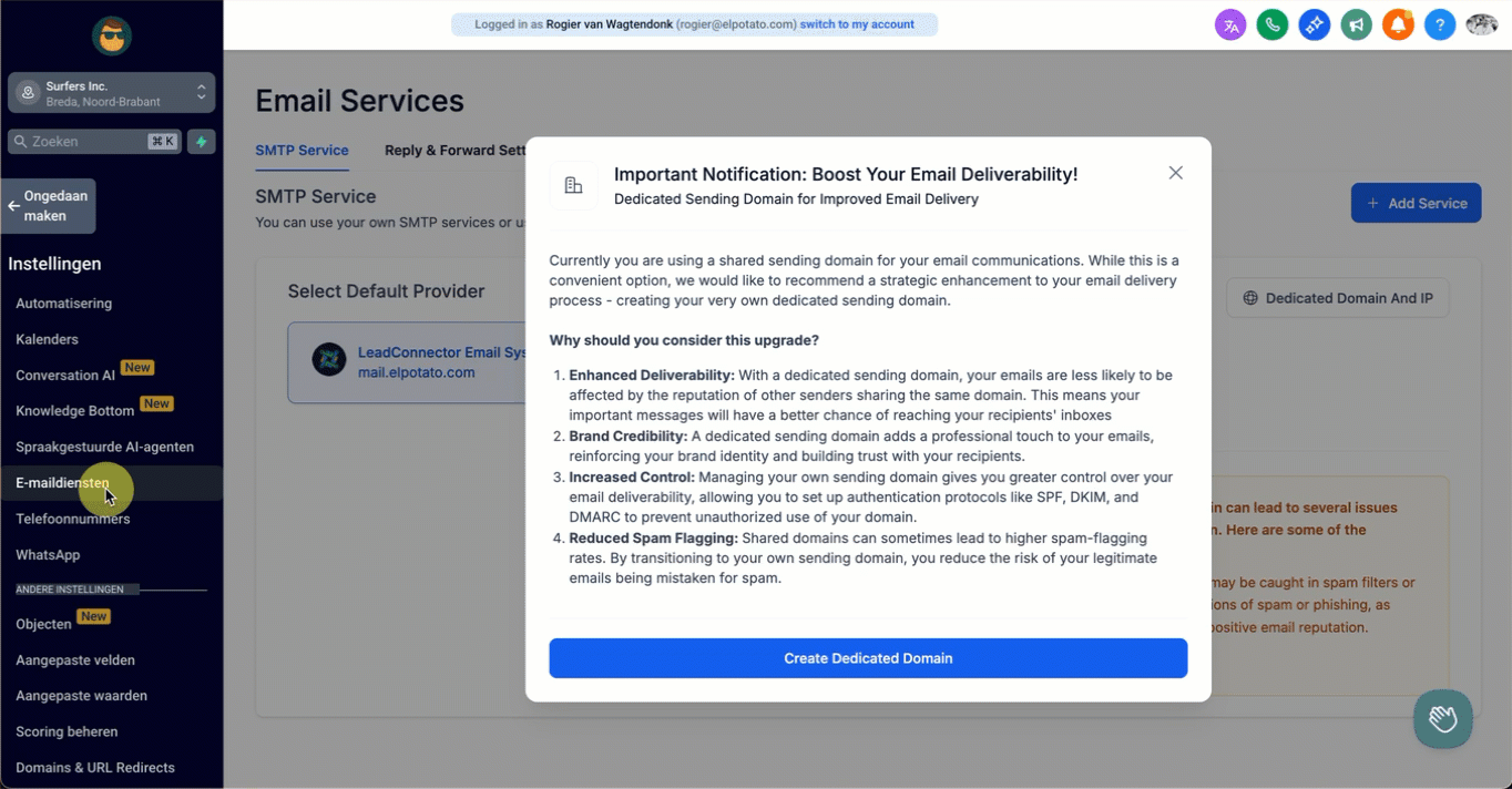 - Ga naar Settings → Email Services → Dedicated Domain & IP.