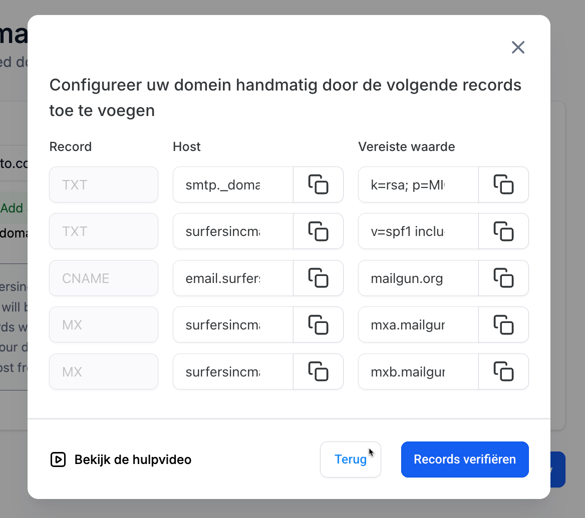 - Je krijgt nu de DNS-records die je moet plaatsen (SPF, DKIM, DMARC, CNAME’s).